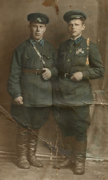 О своих родственниках рассказывает Вологжанин Иван Николаевич: «Я расскажу историю моих бабушки, Вологжаниной Пелагеи Ивановны, и дедушки, Вологжанина Селиверста Афанасьевича. Моя бабушка родилась в Башкирии, в Бирском районе. Встретила молодого человека, моего деда, влюбилась и уехала с ним, жили они г. Угличе. Дедушка до войны служил в НКВД. Призвали на войну сразу. Видел он своего сына Николая, когда он родился, или не успел, я, к сожалению, не могу сказать. Моя бабушка умерла, когда мне было всего 12 лет. Я не успел все расспросить. Поженились они в 1940 году. Ушел дед на фронт в 1941 году. Бабушка сохранила извещение о том, что сержант Вологжанин Селиверст Афанасьевич, уроженец д. Слудка Слудского с/с Немского р-на Кировской области, находясь на фронте, пропал без вести в мае 1942 года. Она также сохранила и свидетельство о браке вместе с маленькой фотографией моего дедушки. Эти документы до сих пор находятся у моей матери. Бабушка так и не вышла больше замуж. На фото - мой дедушка, Вологжанин С. А. (справа), с другом. Спасибо вам и низкий поклон».