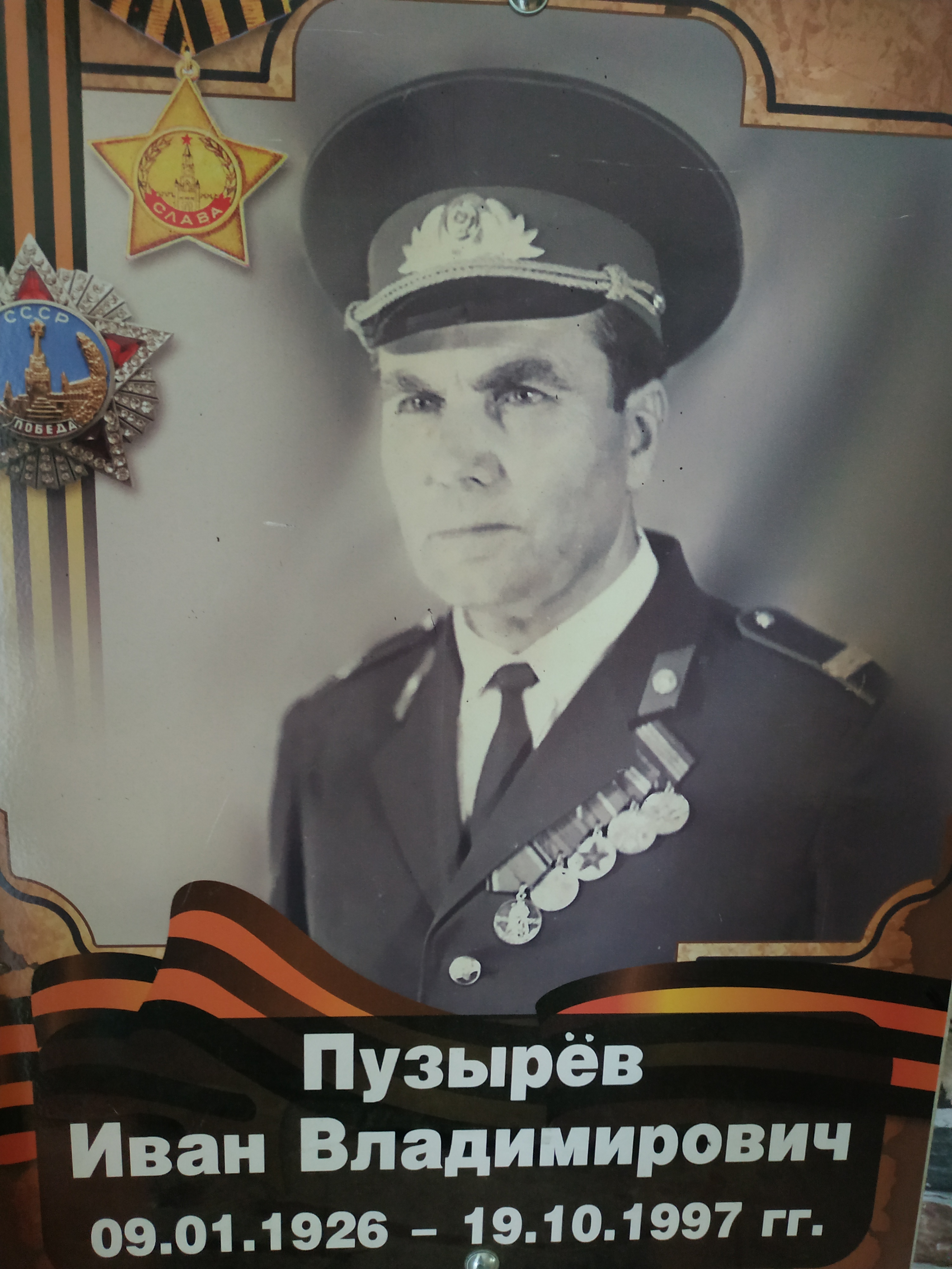 «Пузырев Иван Владимирович родился в 1926 году в Воронежской области. В возрасте 17 лет ушел на войну. Служил в частях НКВД на границе до 1952 года. С 1952 по 1976 годы служил в органах МВД. За все время службы имел 19 наград».